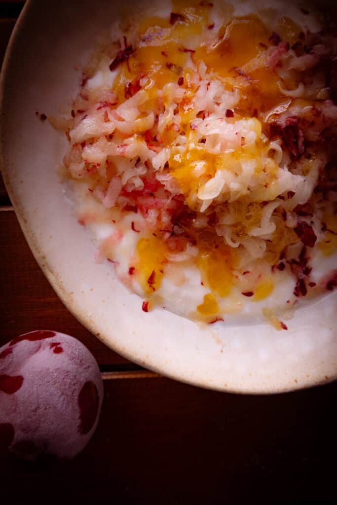 - Die gefrorenen Pfirsichhälften mit einer feinen Reibe (z. B. Microplane oder Käsehobel) direkt über den Joghurt hobeln. Dabei entstehen schöne, zarte Fruchtflocken.