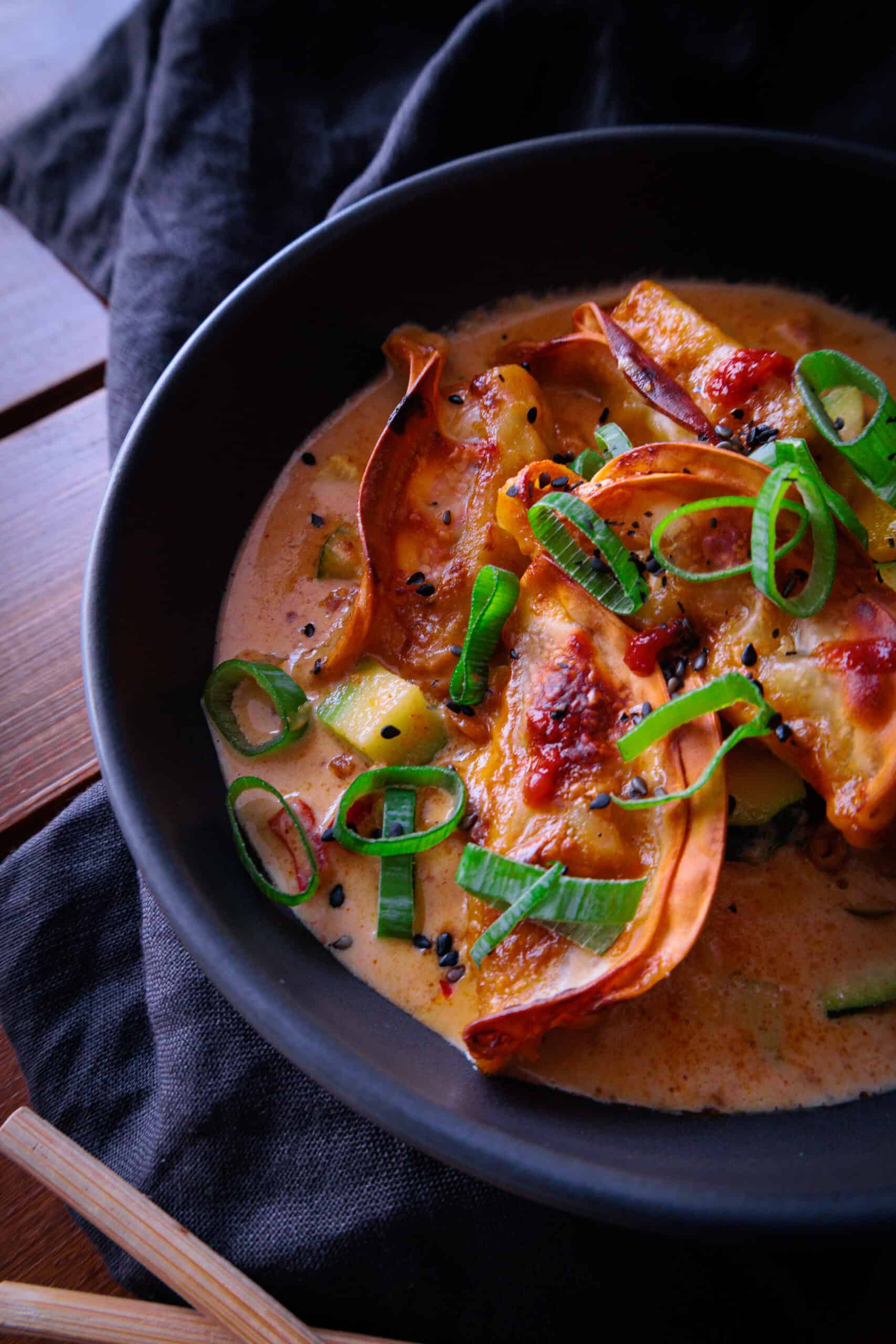 One Pot Gyoza Auflauf mit cremiger Curry-Erdnusssoße