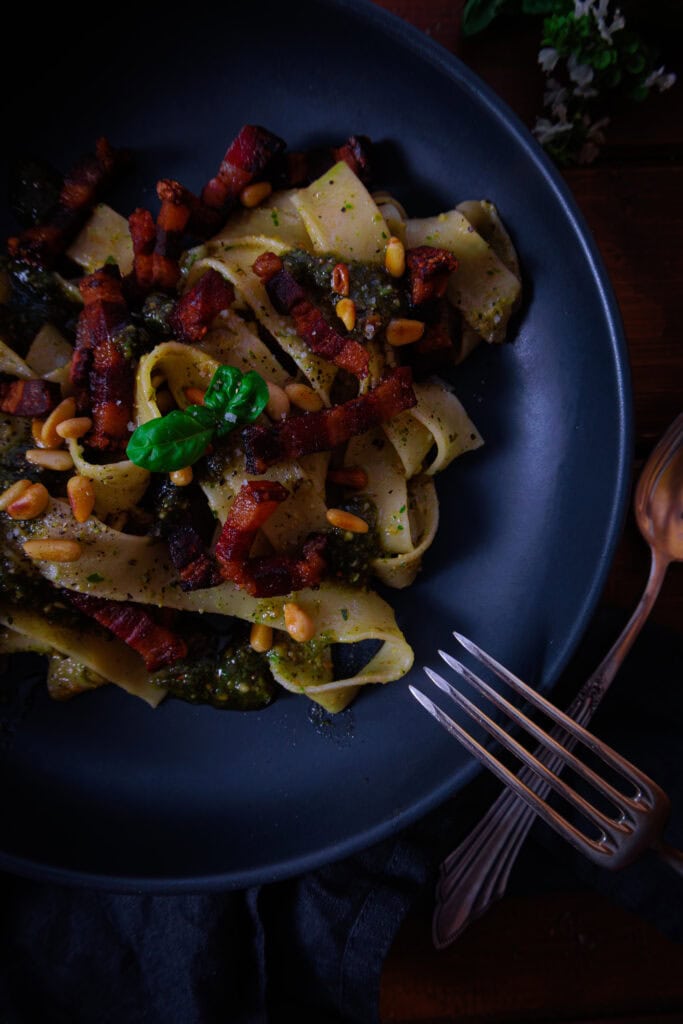 Keyword: einfaches Pastagericht, leckere Pasta mit Pesto, Nudelgericht mit Basilikumpesto und Pancetta, Nudeln mit grünem Pesto und Pancetta, Pancetta, Pasta mit Basilikumpesto, Pasta mit Basilikumpesto und Pancetta, Pasta mit Pesto und Speck